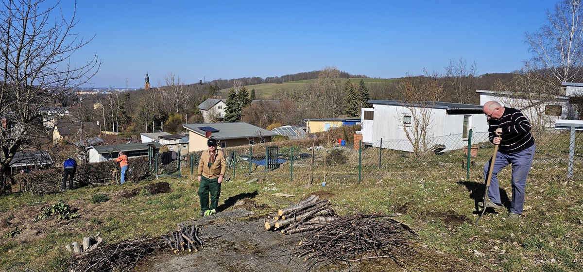 Über die regionale Baumschule in Dittersdorf erfolgt am 21. März 2025 die Anlieferung von drei Apfel- und zwei Birnbäumen sowie fünf Beerensträuchern. Deshalb organisierte der Vorstand für diesen Tag einen außerplanmäßigen Arbeitseinsatz. Mehr als zehn Vereinsmitglieder folgten dem Aufruf und nahmen die Pflanzung vor. Gleichzeitig wurden Pflegemaßnahmen an den vorhandenen Bäumen durchgeführt und ein in die Jahre gekommener Apfelbaum gefällt. Das anfallende Material wurde vor Ort geschreddert und direkt für die Baumscheiben weiterverwendet.